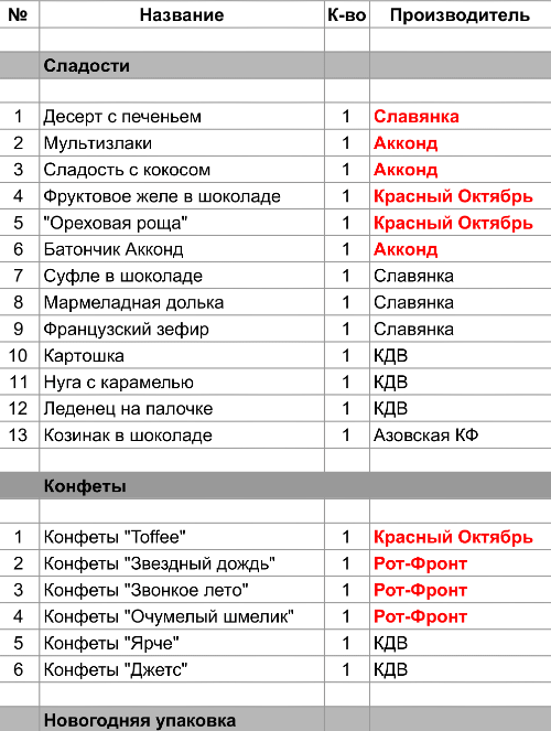 Нуга с карамелью (1 шт), Леденец на палочке (1 шт), Конфеты "Джаззи" (1 шт), Конфеты "Фэнси" (1 шт), Конфеты "Глейс" (1 шт)